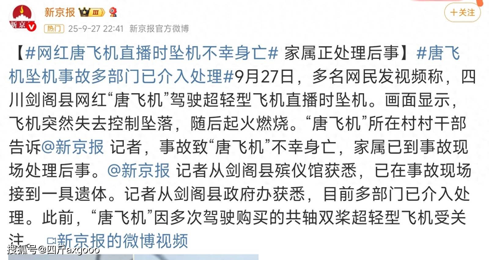 9月27日,一场大V爆发了消息,即电视上受欢迎的互联网唐·费克(Tang Feike)涉嫌飞机飞行时遇到事故。飞机倒在空中,然后直接向地面着火。唐·费克(Tang Feike)的生与死是未知的。随后,媒体证实了飞机死亡的消息。由网民共享的视频酌情决定,当飞机离开时,这是非常正常的。但是,当飞机飞行约10米时,飞机突然爆发了空中,螺旋桨直接摔断了,然后飞机倒塌了。大约半分钟后倒塌后,飞机开始开火。在这段时间里,有人问了弹幕的情况,但没有人回应,没有人看到任何人从镜头里出来,所以尚不清楚唐·费吉(Tang Feiji)自己的处境。 Thentang Feiji自己的帐户不能解释为一个私人帐户,我不知道为什么。 。扩展全文